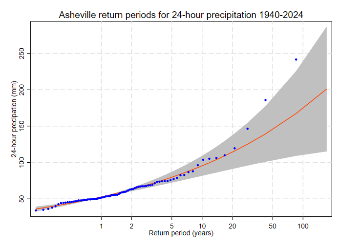The claim of a 1 in 1,000-year event is just political nonsense. There is no reliable way of assessing the probability because it would require a very long run of data – a minimum of 200 or 300 years – with no significant changes in land use and river management. Something as apparently simple as logging in the Black Mountains region in western North Carolina (part of the Blue Ridge Mountains which run from Pennsylvania to Georgia) would change run-off times and thus the risk of flooding in Asheville. The state was simply waving large numbers in an attempt to shift blame for what happened.