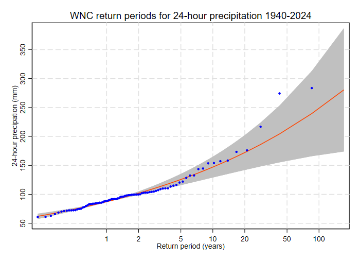 Second, the fitted curve is estimated using the data for 1940 to 2024. What would have been the result if we had carried out the same exercise in 2023 or early 2024 using the data available that point? The extreme value on the right of the graph would be dropped and the slope of the curve would have been less steep, implying lower rainfall levels for 1 in 50 or 1 in 100-year events. In 2023 the 95% confidence interval for 24-hour precipitation for a 1 in 100-year event would have been from 120 to 228 mm with a central estimate of 155 mm. Adding the data for 2024 would have changed that confidence interval to 133 to 273 mm with a central estimate of 170 mm. On the other hand, the changes in the confidence intervals for 1 in 20-year events are much smaller.