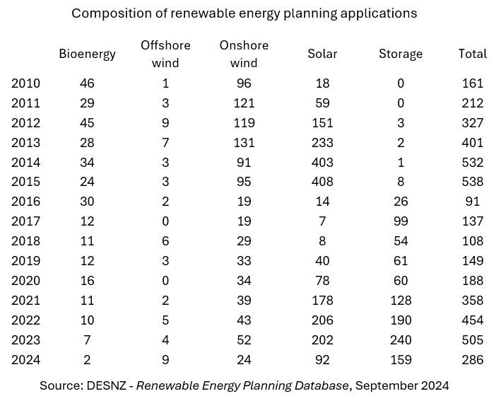 The table shows the distribution of applications by broad categories. Bioenergy is a mixed bag including anaerobic digestion and landfill gas plus energy from waste and biomass combustion. Storage consists largely of battery projects but includes compressed air and pumped hydro. All of these projects are for utility-scale use, i.e. a minimum of 5 MW of either generation capacity or supply.