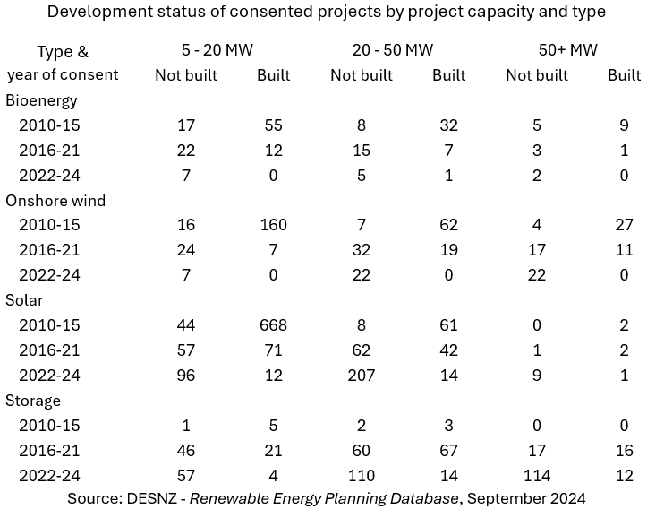 Overall, since 2016 there has been considerable variation by project type and size. There appears to be no consistent patterns that would suggest, for example, difficulties in obtaining grid connections or sources of finance are the primary reason for projects not being built. In large part there may a lot of idiosyncratic factors that account for these decisions.