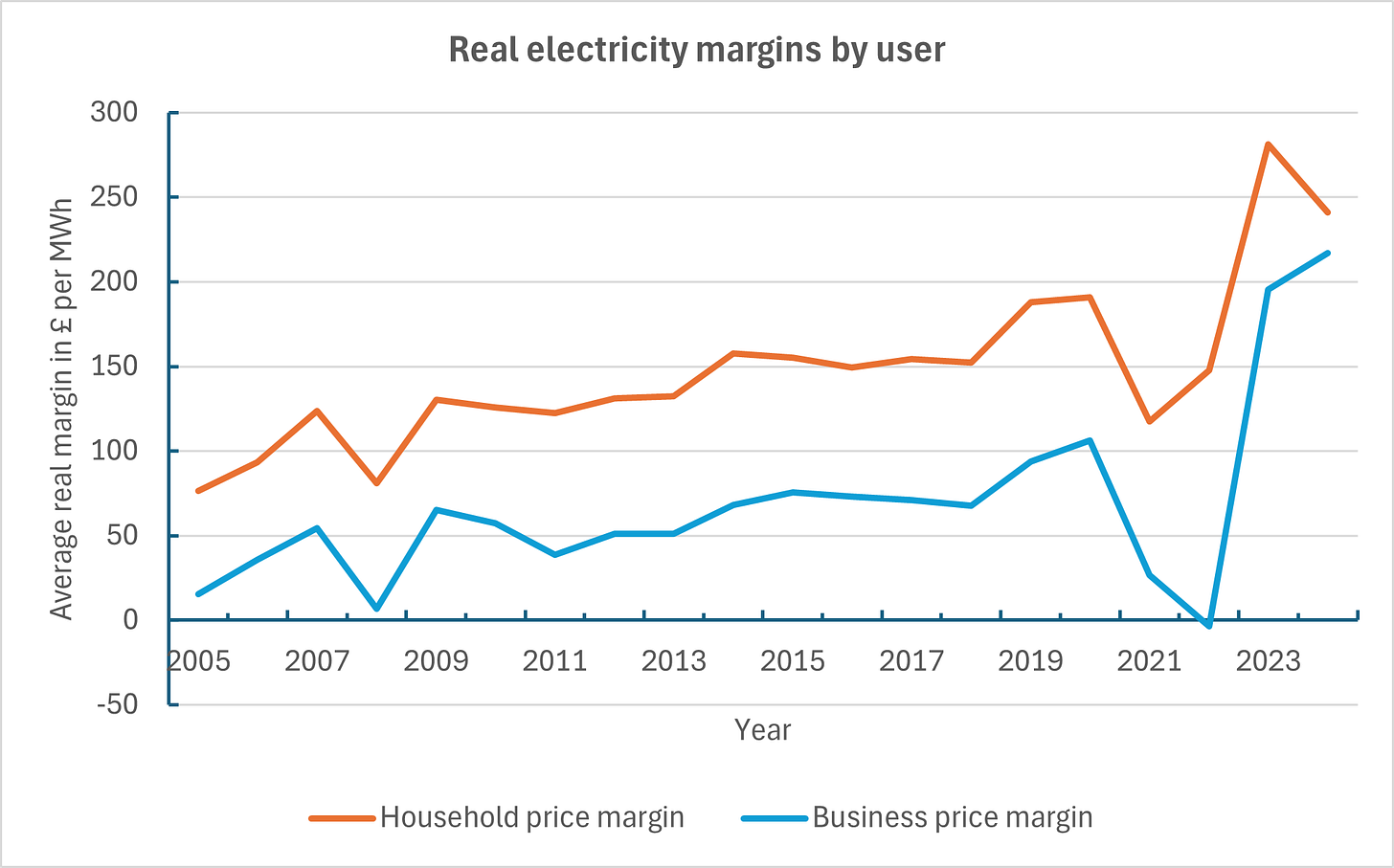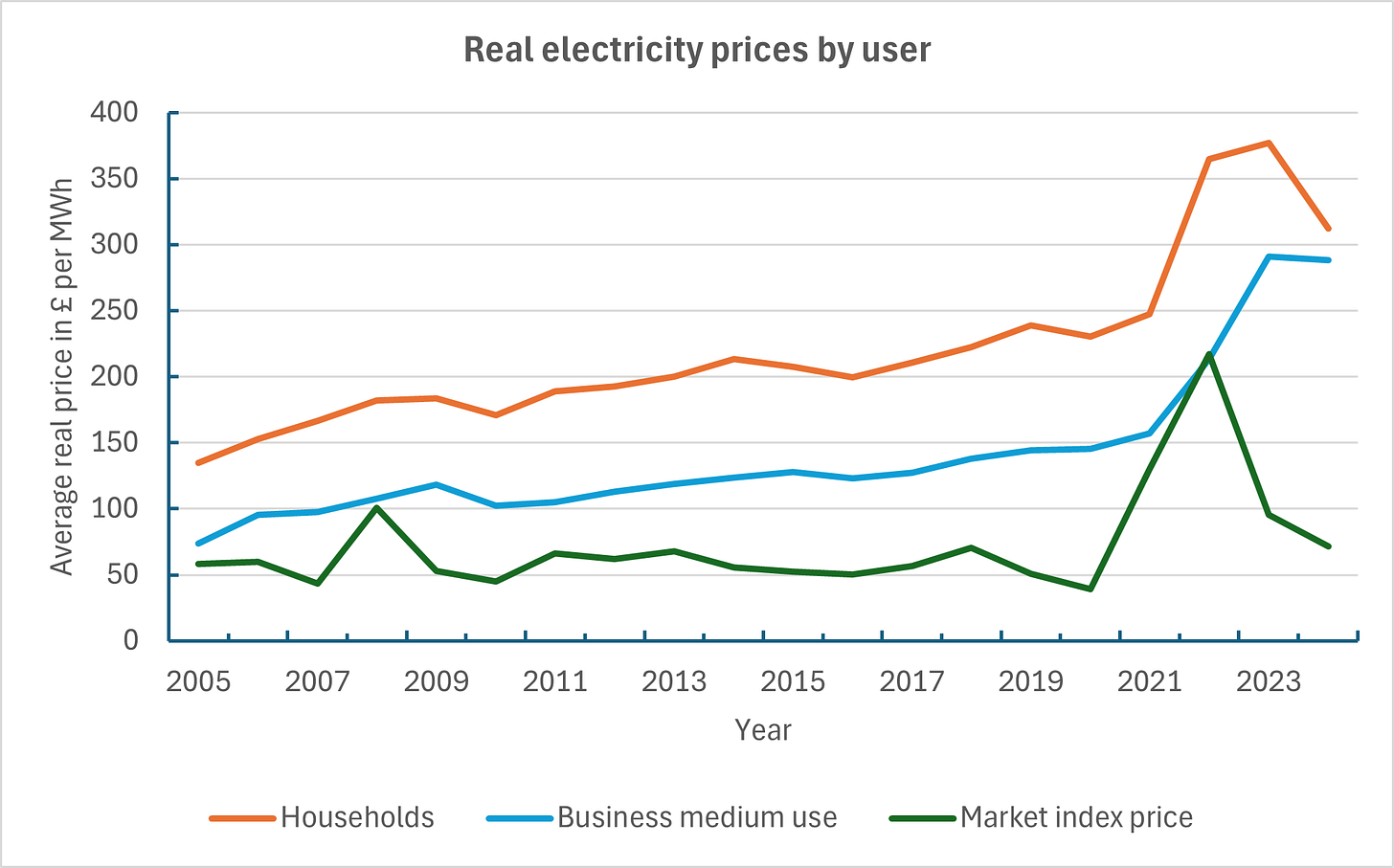 If you told that to policymakers, probably 95% of them would be convinced that you were joking or mad. The reason is obvious if you look at the lines for business and household prices. The average real price for medium business users – again excluding the spikes of 2008 and 2021-23 - increased from £105 per MWh in 2005-14 to £156 in 2015-24. Similarly for households the decade average real prices increased from £178 to £232 per MWh. There are very clear and large upward trends in user prices even though market prices have not changed.