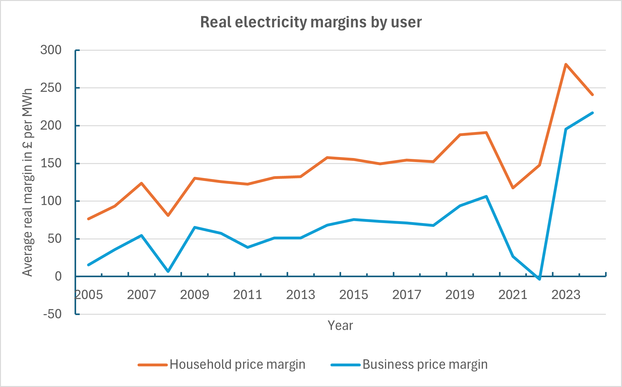 The price margins are largely determined by regulatory and policy decisions. The three major components of the margins are: (a) levies to cover the costs of subsidies and other policy interventions, (b) system and supplier costs including balancing costs and capacity market levies, and (c) regulated network charges. The upward trend in the price margins is not a recent one, but it has occurred in a series of abrupt steps. The business price margin increased from £25 in 2005-06 to £61 in 2009-10. It stayed roughly constant up to 2018 but then increased sharply to about £100 in 2019-20 and again to £217 in 2024.
